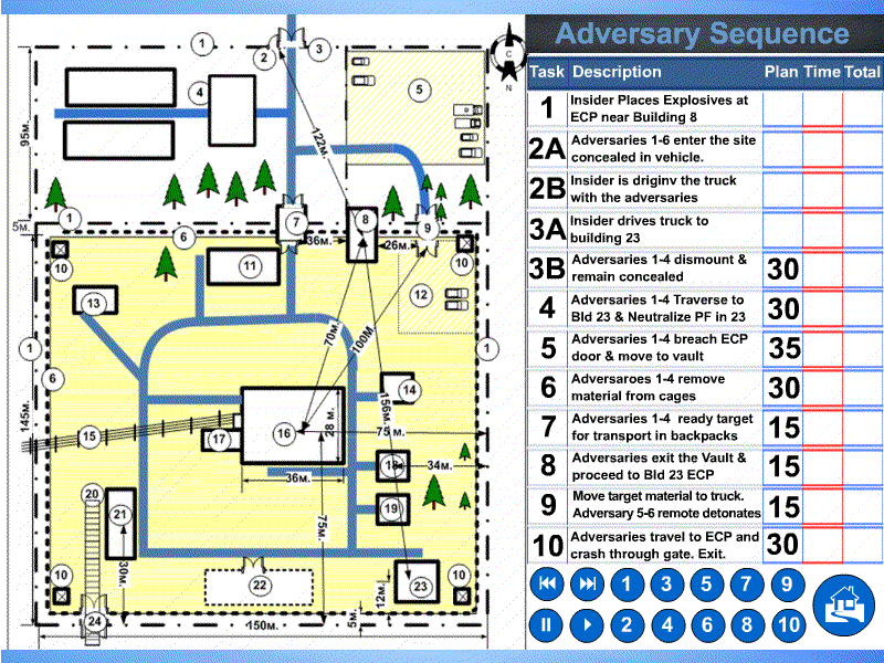 The following example demonstrates the potential pathway an adversary composed of a passive insider and 6 active outsider could take against the established SNRI physical protection system and other security measures.
